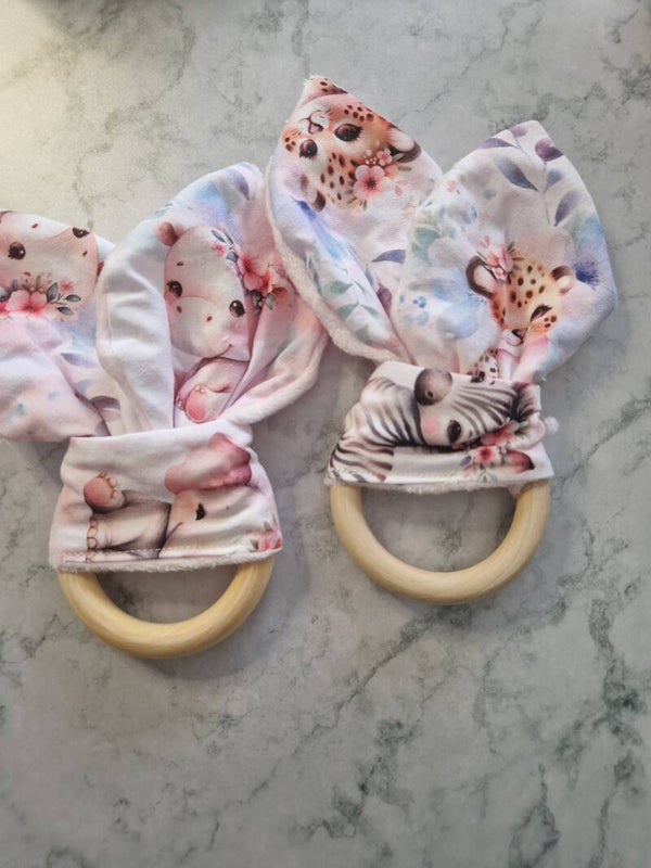 - Eveil et confort : Les textures du coton et du minky doux éveillent les sens, tandis que l’anneau en bois est parfait pour les dents de bébé.